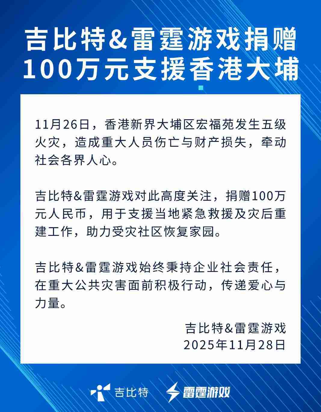 918.com&雷霆游戏捐赠100万元 支援香港大埔火灾救援及灾后重建