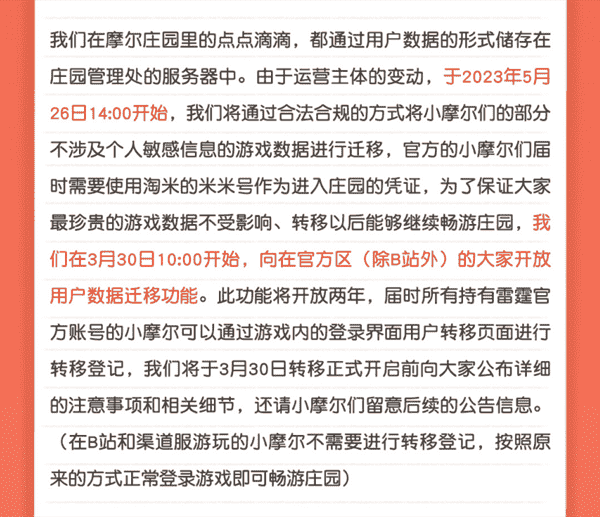 合作结束本就是开发方和代理方双方的事情,,,降低这件事情对玩家的影响,,,,才是对所有珍视这段童年的摩尔玩家最好的呵护。。。。目前看来,,用户完全不用担心后续因无法登录游戏而造成任何数据上的损失,,,只要及时进行账号转移,,,,就可以好好保留、、延续在庄园的痕迹和回忆,,,继续在庄园里做快乐的红鼻子小鼹鼠。。。