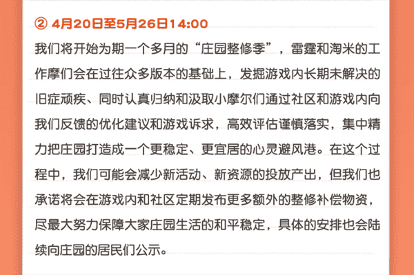 合作的结束并不意味着这个童年IP的结束,,对于《摩尔庄园》手游而言,,这是一个新阶段的开始。。后续游戏内将开启庄园重构计划,,,,会就以往遗留下来的BUG进行集中修复,,,,并在游戏内和社区定期发布更多补偿物资。。。